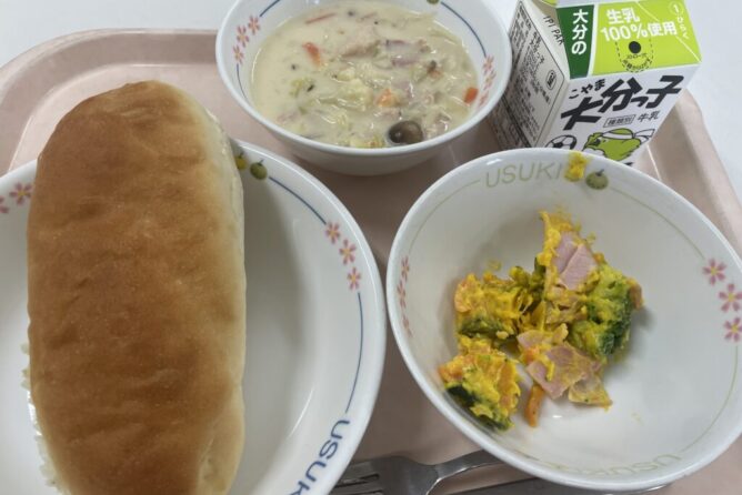 メニューは、コッペパン・牛乳・白菜のクリーム煮・かぼちゃサラダ。